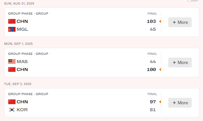 中国队首场比赛狂胜蒙古队58分,第二场中国队狂胜马来西亚队56分,第三场比赛中国队16分优势大胜韩国队。中国队3场比赛合计狂胜130分,以小组第一直通八强。
